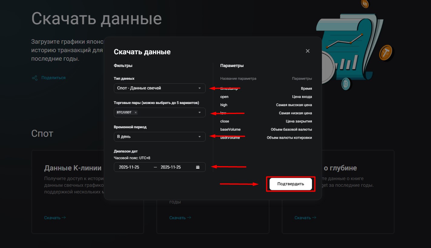 Выбрать Тип данных - Спот-Свечные графики; анализируемую Торговую пару и определить какую иностранную валюту использовать для конвертации; Временной период - В день; Диапазон дат анализируемого периода. Затем нажать на кнопку «Подтвердить».