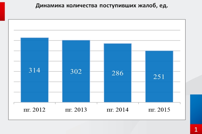 Так, количество жалоб данной категории снизилось с 53 единиц за полугодие 2014 года до 36 единиц за полугодие 2015 года, то есть на 17 единиц или на 32%.