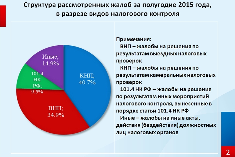 - на решения, вынесенные в порядке статьи 101.4 НК РФ, – 23 жалобы или 9,5% (за полугодие 2014 года – 11,6%);
