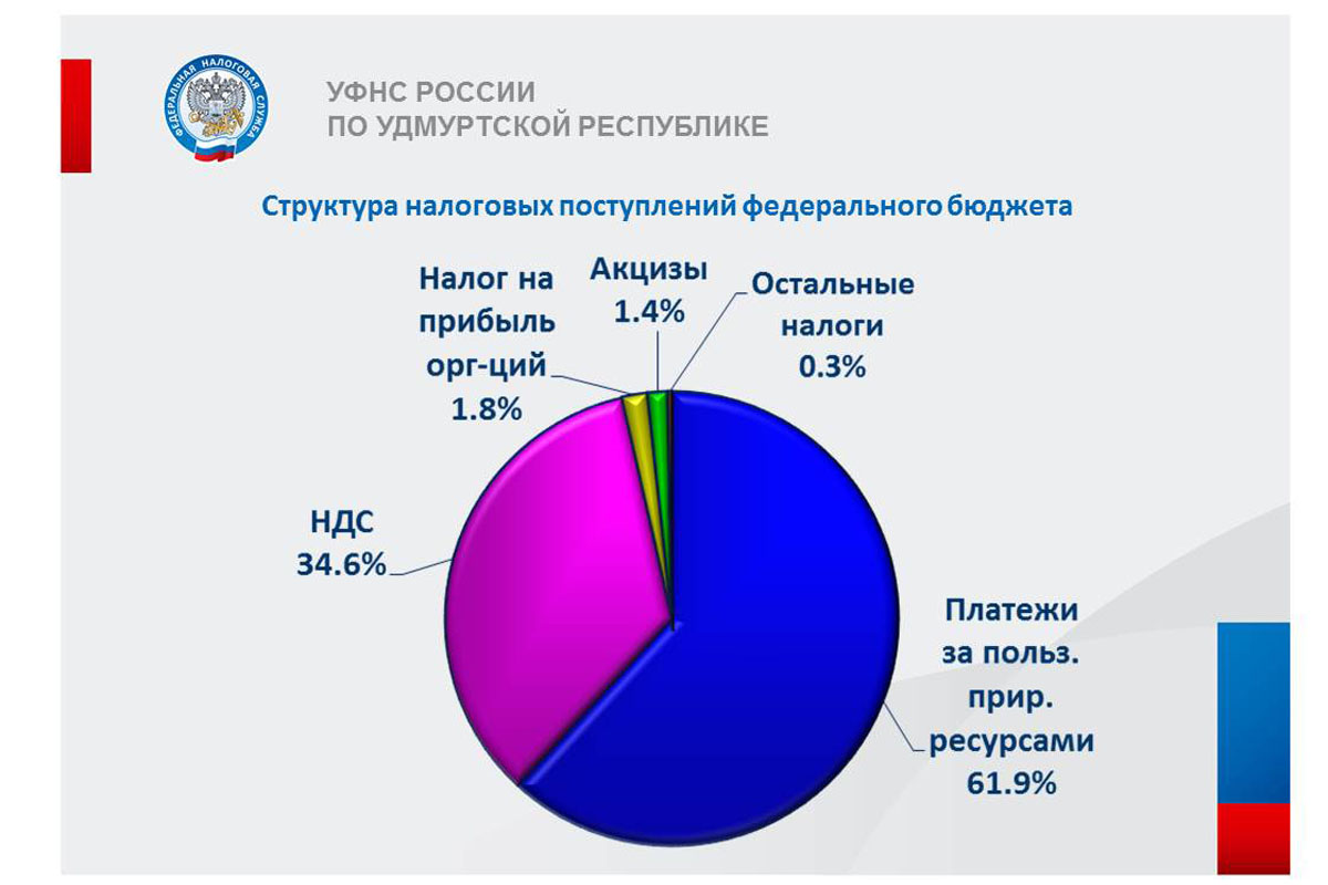 В федеральный бюджет мобилизовано 85,5 млрд рублей (68,7%), в консолидированный бюджет Удмуртской Республики – 38,9 млрд рублей (31,3%).