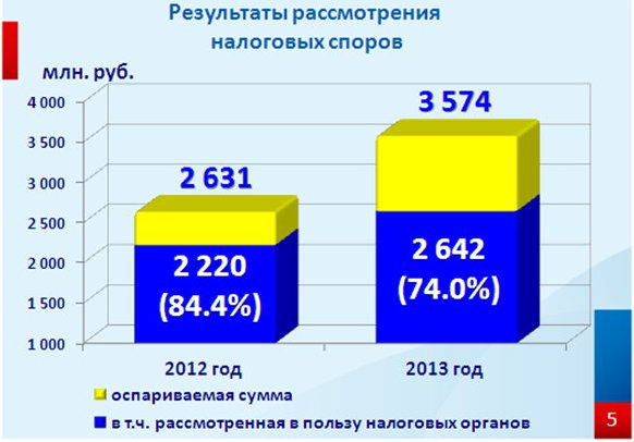 За 2013 год из общего количества рассмотренных споров 99% (18 156 дел) разрешено пользу налоговых органов. При этом сумма требований, рассмотренных судами в пользу налоговых органов, составила 74% от оспариваемой суммы.
