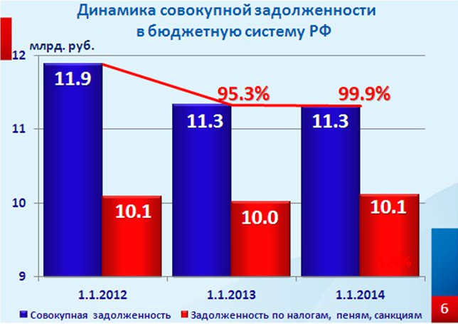 Меры, предпринимаемые налоговыми органами для снижения уровня накопленной задолженности, позволили выйти к весьма позитивному итогу: за три последних года, уровень совокупной задолженности перед бюджетом и государственными внебюджетными фондами в целом по Удмуртской Республике, снизился на сумму порядка 600 млн. рублей, и составил на 1 января 2014 года - 11 млрд. 315 млн. рублей.