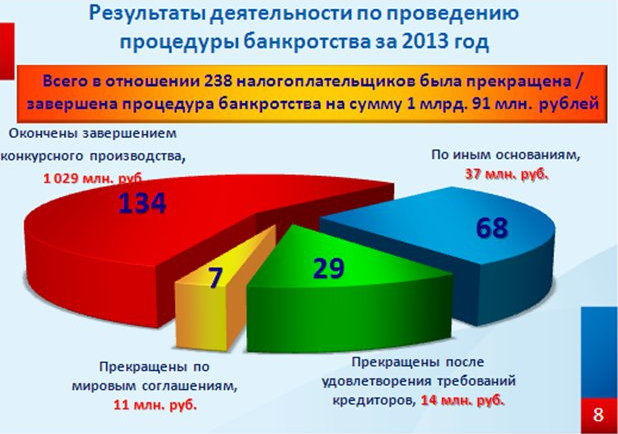 Всего в отношении 238 налогоплательщиков в течение 2013 года была прекращена, либо завершена процедура банкротства с общей суммой задолженности 1 млрд. 91 млн. рублей.