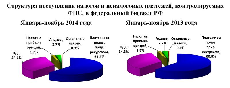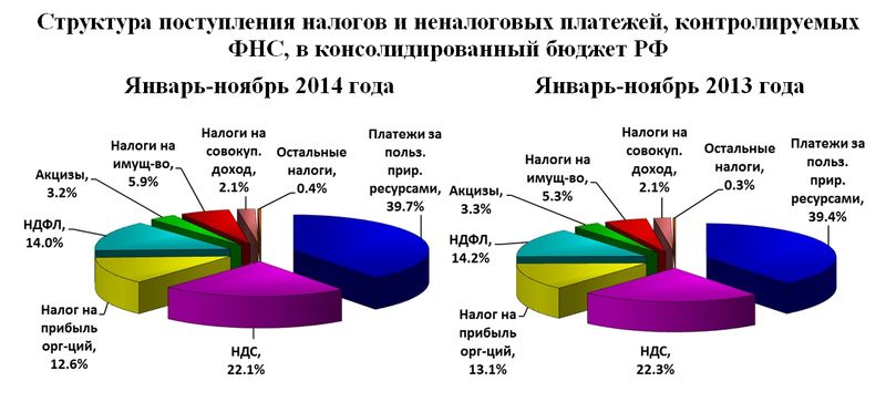 По сравнению с аналогичным периодом 2013 года объем поступления налогов и иных платежей, контролируемых ФНС России, в консолидированный бюджет РФ увеличился на 8,7 миллиардов рублей или на 8,1%. Рост отмечен по всем доходообразующим налогам.