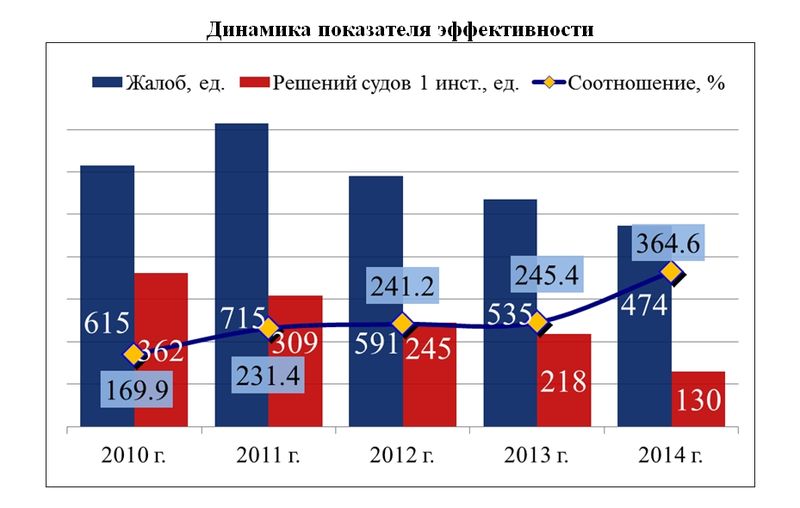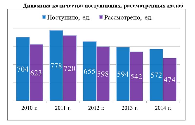 На нижеприведенной диаграмме видно, что количество жалоб, рассмотренных по итогам 2014 года, меньше уровня предыдущих четырех лет.