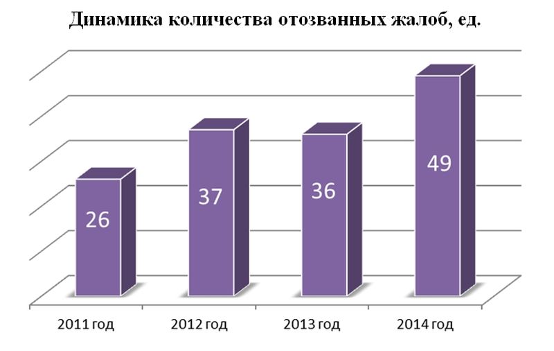 Ежегодно возрастает и количество отозванных жалоб в связи с устранением возникших споров и разногласий в ходе их рассмотрения. Так, по итогам 2014 года налогоплательщиками отозвано 49 жалоб, что на 13 единиц или в 1,4 раза больше, чем 2013 год.