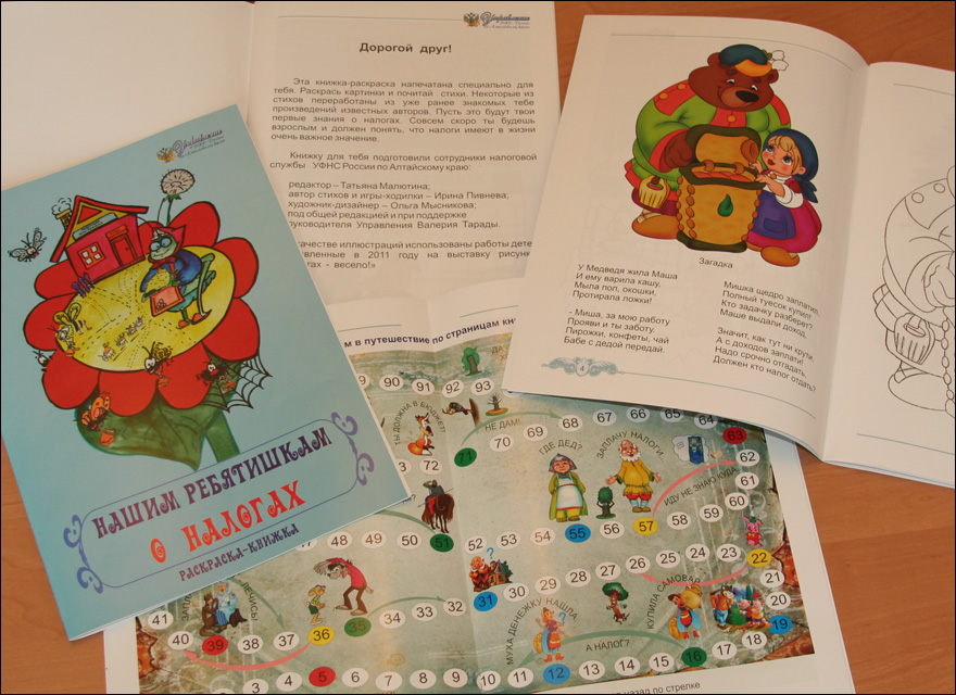 Алтайский край представил памятку по досудебному аудиту, путеводители по официальному сайту и по сервисам налоговой службы, учебник по налогам для школьников, раскраску о налогах, газету "Мой налоговый советник" и другую продукцию. Коллеги высоко оценили разработки Алтайского края в области работы с налогоплательщиками, особый интерес вызвала игра-ходилка, которая дает возможность ребенку получить первое представление о налогах.