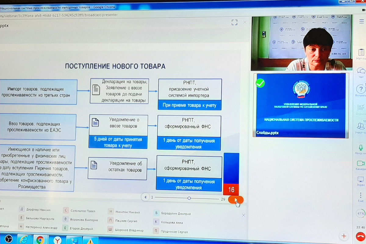 24 мая Управление ФНС России по Алтайскому краю провело вебинар на тему: «Национальная система прослеживаемости импортных товаров». Спикером онлайн-семинара выступила заместитель начальника отдела камерального контроля Марина Трауд.