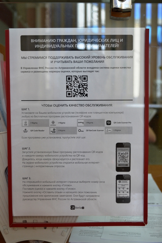 Чтобы оценить качество обслуживания в налоговой инспекции, необходимо установить на мобильном устройстве (телефоне или планшетном компьютере) любую из бесплатных программ распознавания QR- кодов.