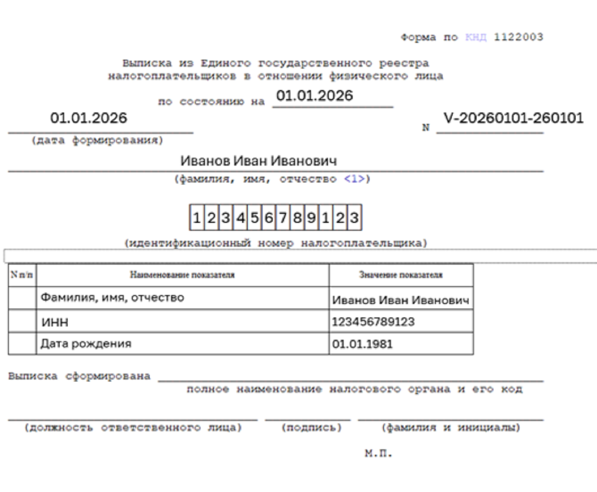 С 1 января 2026 года свидетельство о постановке на учет в налоговом органе упраздняется. Для физических лиц постановку на учет будет подтверждать выписка из Единого государственного реестра налогоплательщиков. Выписка подписывается усиленной квалифицированной электронной подписью и равнозначна выписке на бумаге, подписанной собственноручной подписью должностного лица и заверенной печатью налогового органа.