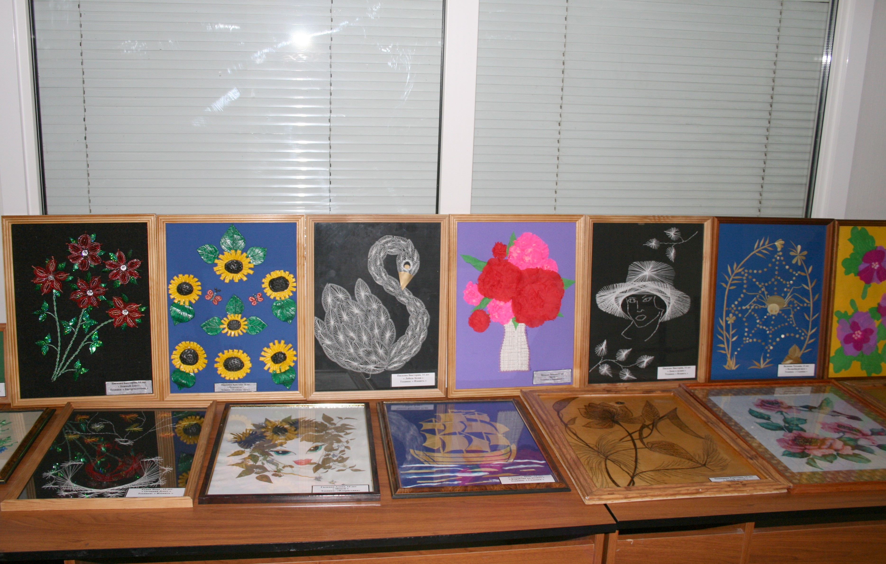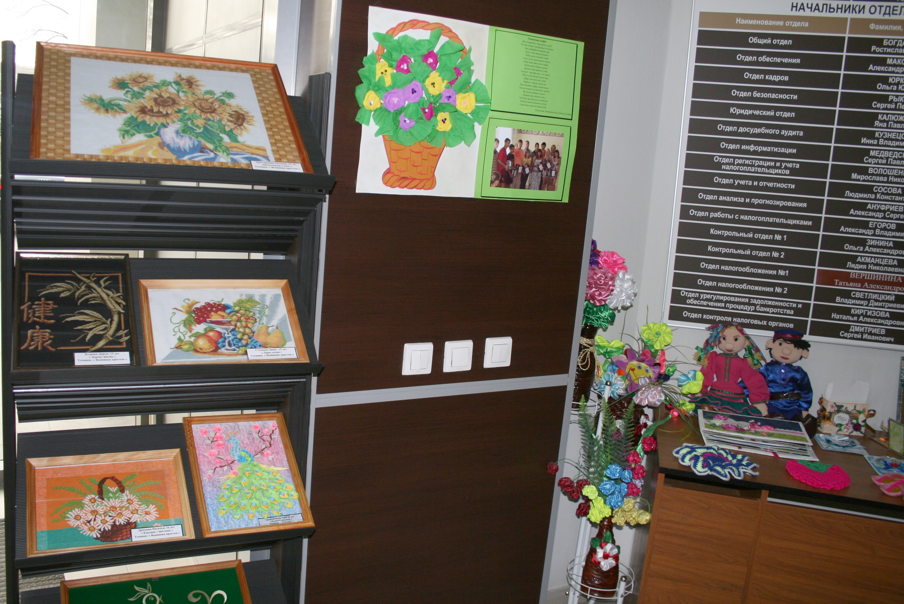 На выставке было представлено множество красивых и необычных рисунков, созданных детьми сотрудников инспекций и Управления, поделок, сделанных руками ребят-воспитанников подшефного детского дома: это и художественно оформленные открытки, фоторамки, фотоальбомы, вышитые картины.