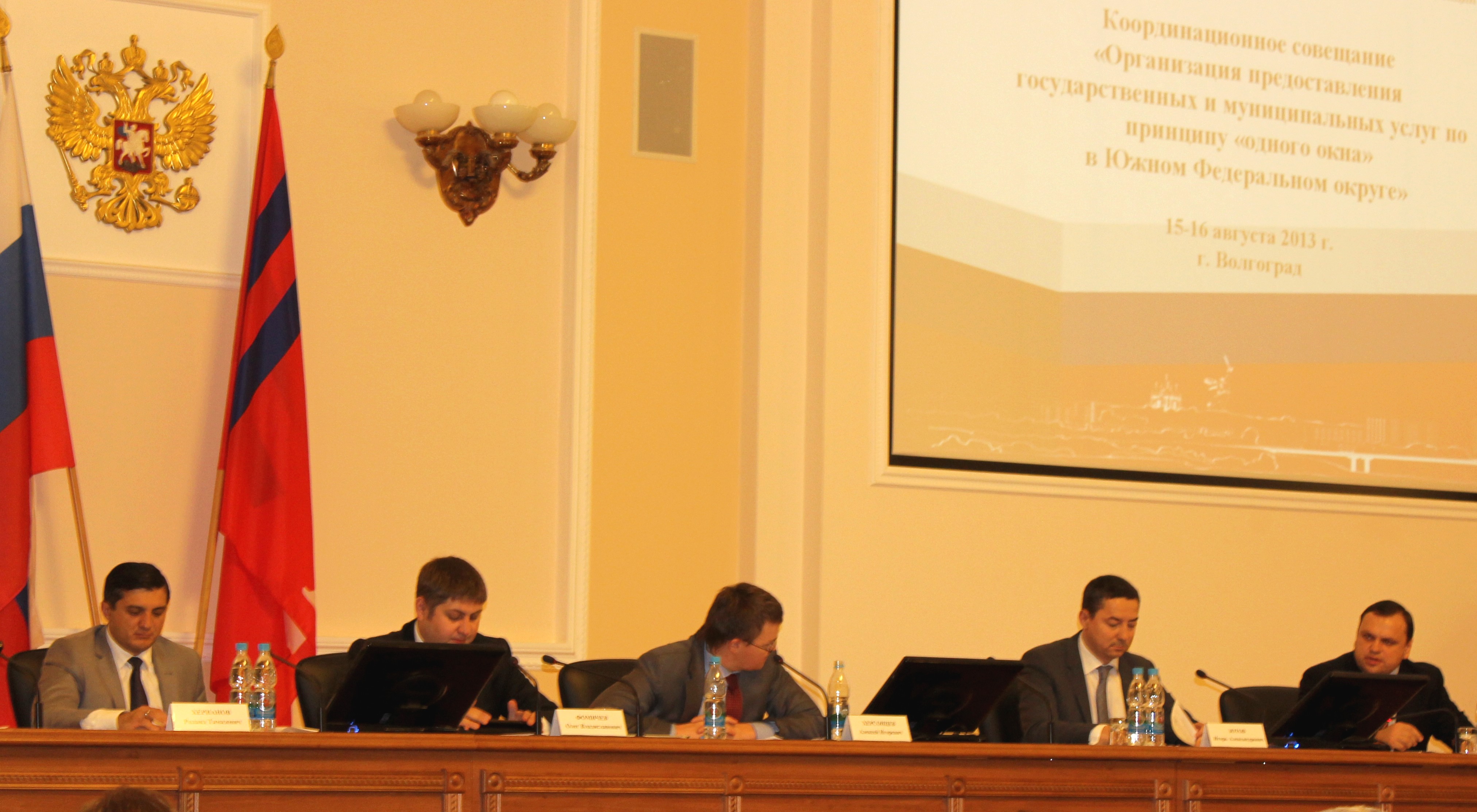 В рамках мероприятия также состоялось координационное совещание по вопросу организации предоставления государственных и муниципальных услуг по принципу «одного окна»» в Южном федеральном округе. Совещание провел заместитель министра экономического развития Российской Федерации О.В. Фомичев. В обсуждении приняли участие директор Департамента государственного регулирования в экономике А.И. Херсонцев, главный инспектор Полномочного представителя Президента РФ в ЮФО Д.Г. Сафонов, заместитель руководителя Росреестра Д.А. Васильев, заместитель Председателя Правления Пенсионного фонда России Н.В. Елистратов, начальник Управления по организации регистрационного учета граждан РФ ДОРПР ФМС России В.И. Маленков, первый заместитель председателя Правительства Волгоградской области Р.Т. Херианов, а также руководство исполнительных органов власти Волгоградской, Астраханской, Воронежской, Ростовской областей, Краснодарского края, Республик Адыгея и Калмыкия. От ФНС России в совещании принял участие начальник отдела по работе с налогоплательщиками Управления информационных технологий Д.А. Марачевский.