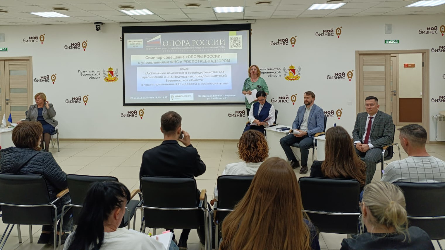 Представители Управления ФНС России по Воронежской области 29 апреля 2025 года на базе центра «Мой бизнес» приняли участие в семинаре-совещании по вопросам изменения в законодательстве для организаций и индивидуальных предпринимателей в части применения ККТ и работы с «самозанятыми».