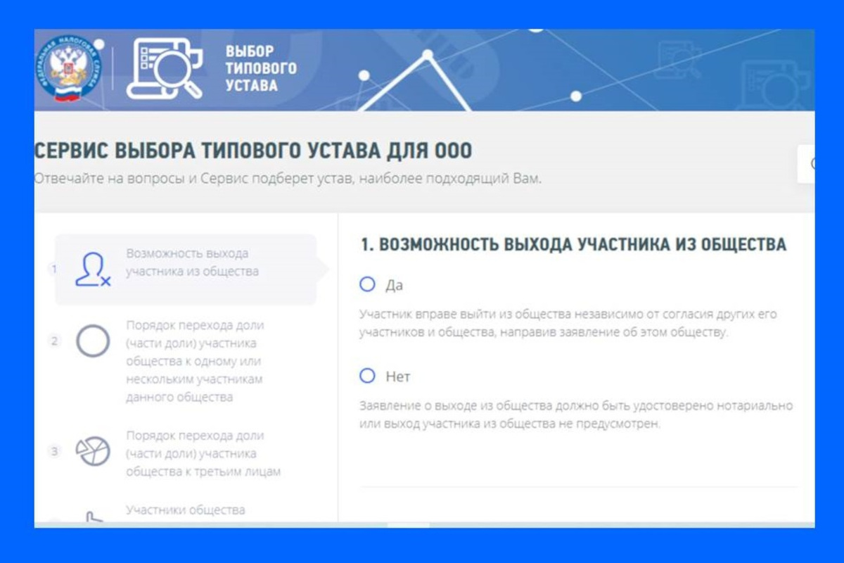 Выбор типового устава». Он предлагает 36 утвержденных типовых уставов. Плюсы их использования заключаются в экономии времени: устав не требуется предоставлять в налоговый орган, при его изменении не придется вносить правки. Система предлагает налогоплательщику ответить на несколько вопросов и на основе ответов рекомендует подходящий тип устава.