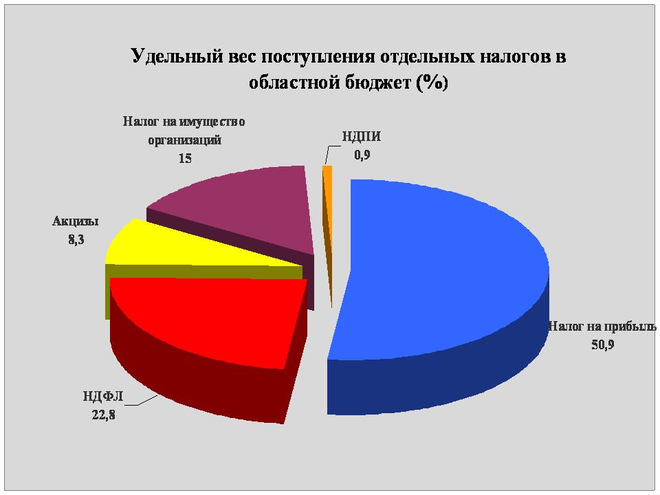 Основную часть доходов областного бюджета составляют поступления пяти налогов: налога на прибыль организаций (50,9%), налога на доходы физических лиц (22,8%), налога на имущество организаций (15%), акцизов (8,3%) и транспортного налога (1,3%).