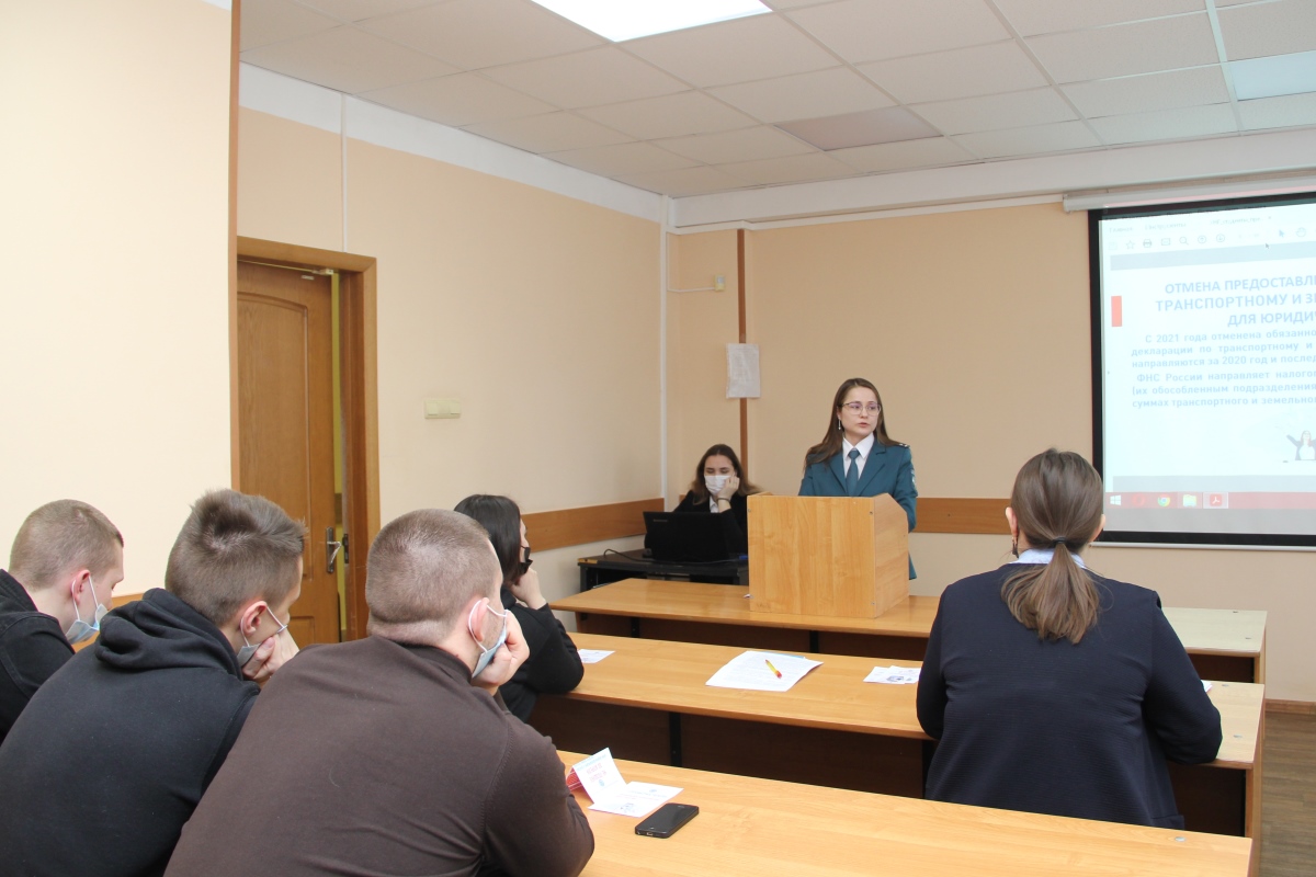 Старший специалист второго разряда отдела работы с налогоплательщиками Управления О.В. Титкова рассказала студентам о прекращении действия ЕНВД, новшествах в патентной системе налогообложения, отмене деклараций по земельному и транспортным налогам для юридических лиц.