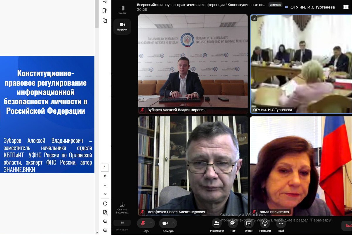 В Орле состоялась Всероссийская научно-практическая конференция «Конституционные основы обеспечения прав человека и национальной безопасности государства», организованная сотрудниками Орловского государственного университета имени И.С. Тургенева. Спикером мероприятия стал заместитель начальника отдела контроля выполнения технологических процессов и информационных технологий УФНС России по Орловской области Алексей Зубарев. Он выступил с темой: «Конституционно-правовое регулирование информационной безопасности личности в Российской Федерации» и подробно объяснил, почему важно защищать личные данные россиян и как это регулируется Конституцией нашей страны.