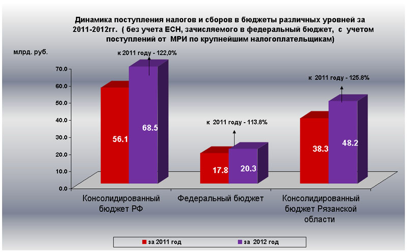 По оперативным данным Управления Федеральной налоговой службы по Рязанской области в 2012 году в консолидированный бюджет Российской Федерации поступило 68,5 млрд. рублей, что выше поступлений аналогичного периода 2011 года на 22,0% или на 12,3 млрд. рублей.