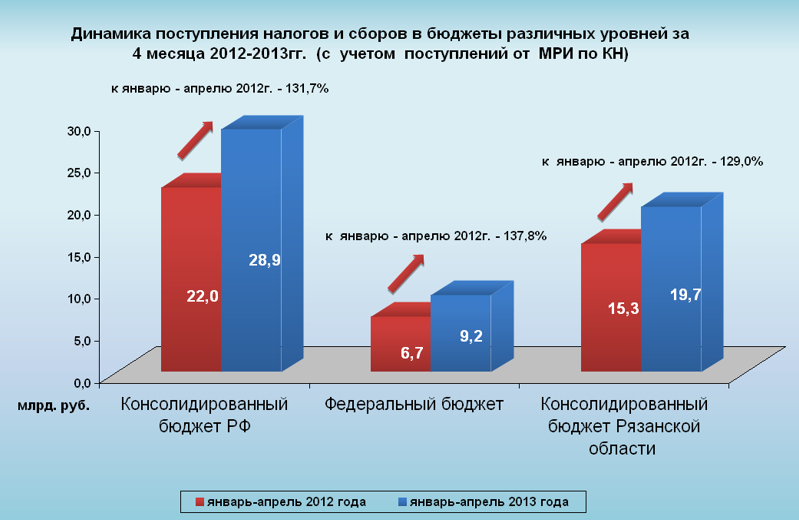 Управлением Федеральной налоговой службы по Рязанской области подведены итоги налоговых поступлений за 4 месяца 2013 года. По данным статистической налоговой отчетности 1-НМ за указанный период в консолидированный бюджет Российской Федерации поступило 28,9 млрд. рублей, что выше поступлений аналогичного периода 2012 года на 31,7% или на 6,9 млрд. рублей.