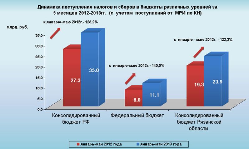 Из общей суммы поступлений доходы федерального бюджета составили 11,1 млрд. руб., что на 40,0% превышает показатель соответствующего периода прошлого года, доходы консолидированного бюджета Рязанской области возросли на 23,3% и составили 23,9 млрд. рублей, из которых доходы местных бюджетов сложились в размере 2,9 млрд. рублей, на 8,8 % превысив аналогичный показатель 2012 года.