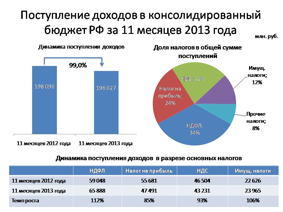По итогам работы за 11 месяцев 2013 года в консолидированный бюджет Российской Федерации поступило 196 млрд. руб., что на 1% меньше поступлений аналогичного периода 2012 года.