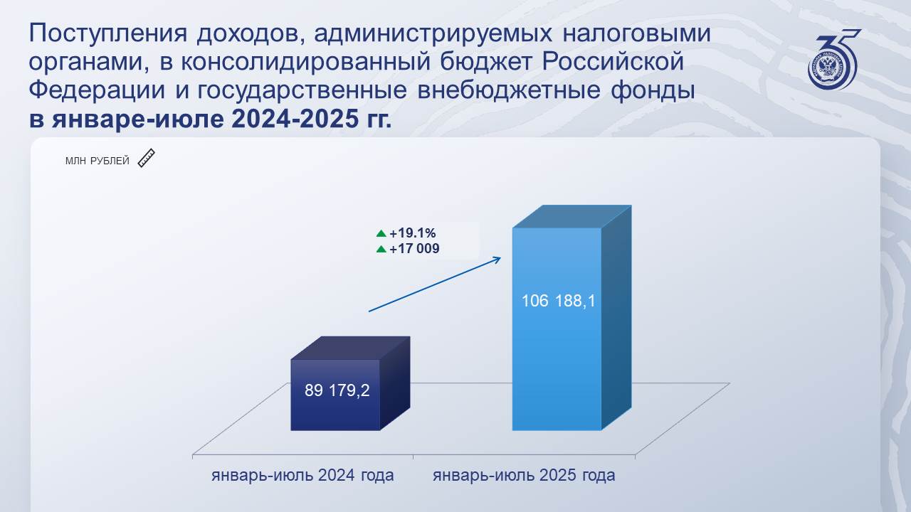 мобилизовано 106 188,1 млн рублей, что на 17 009 млн рублей больше поступлений января-июля 2024 года, темп роста составил 119,1%, в том числе во внебюджетные фонды мобилизовано 41 943,4 млн рублей или на 169,8 млн рублей меньше, чем в январе-июле 2024 года.