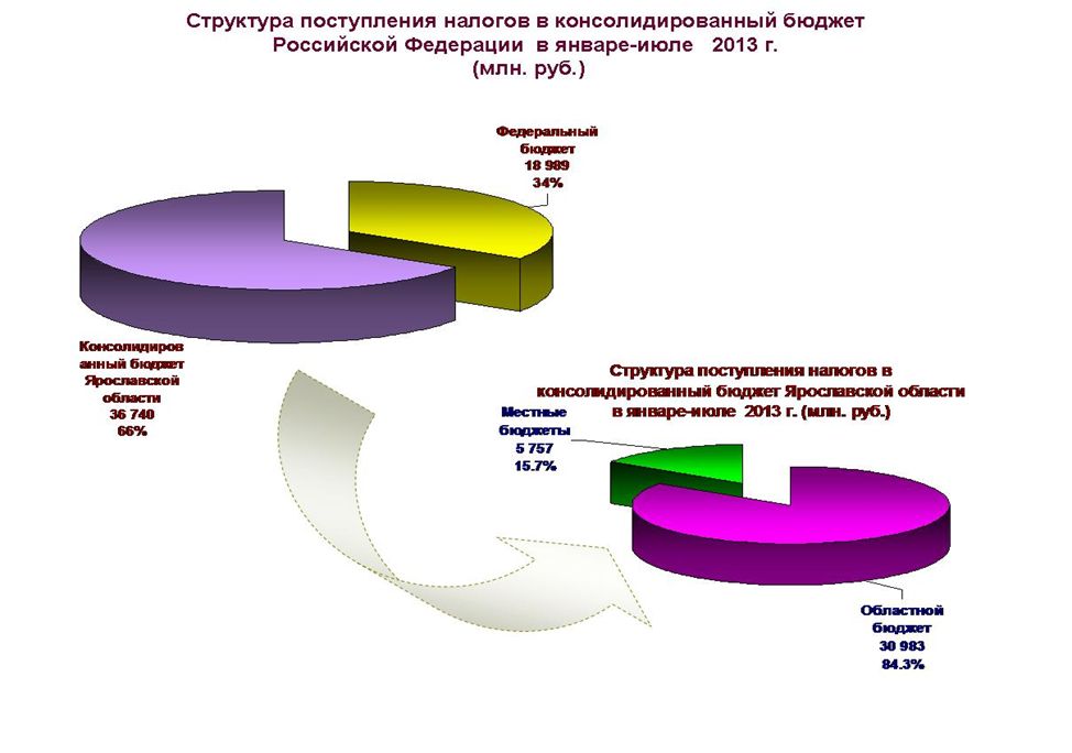 В консолидированный бюджет Российской Федерации с территории Ярославской области за январь-июль 2013 года поступило 55 729 млн. рублей, что на 4 884 млн. рублей (или 9,6%) больше, чем за аналогичный период прошлого 2012 года.