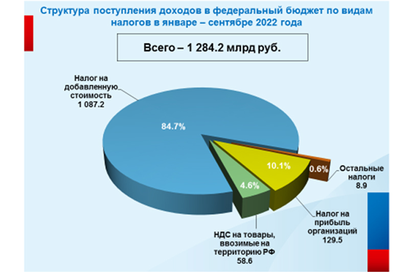 Второе место в структуре доходов в отчетном периоде занимает налог на добавленную стоимость, доля которого составила 33,8% или 1 трлн 87,2 млрд рублей, темп по налогу составил 114,7% относительно поступлений января-сентября 2021 года.