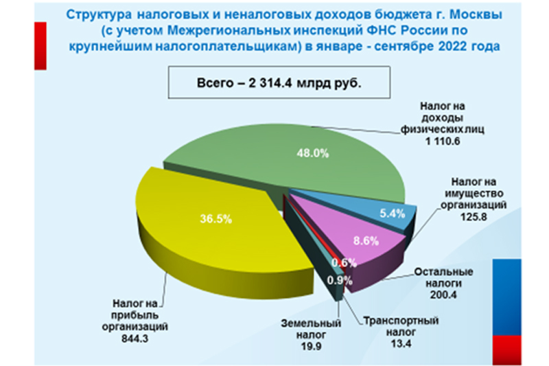 В бюджет города Москвы с учетом доходов от крупнейших налогоплательщиков, администрируемых МИ ФНС РФ по КН, в январе – сентябре 2022 года поступило 2 трлн 314,4 млрд рублей c темпом 113,1 процента.