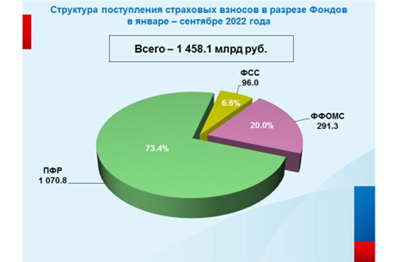 Объем перечисленных страховых взносов во внебюджетные фонды в январе - сентябре 2022 года увеличился на 3,8% относительно соответствующего периода прошлого года и составил 1 трлн 458,1 млрд рублей, в том числе на обязательное пенсионное страхование – 1 трлн 70,8 млрд рублей (73,4%), обязательное социальное страхование – 96,0 млрд рублей (6,6%), обязательное медицинское страхование – 291,3 млрд рублей. (20,0%).