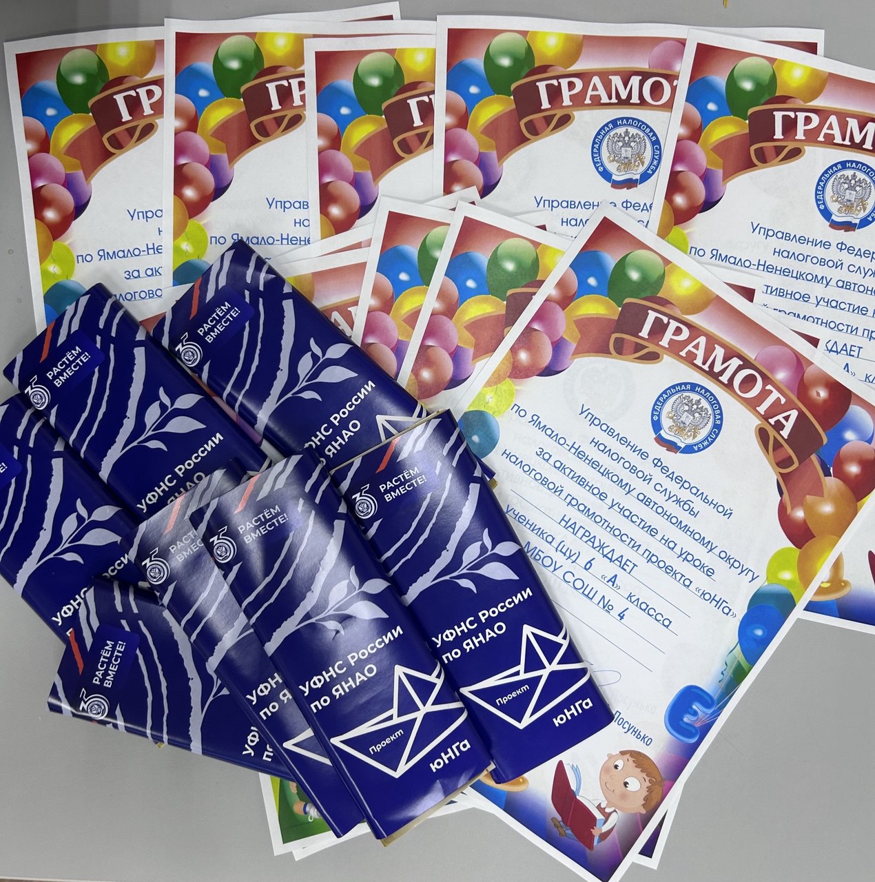 Руководитель службы пожелал школьникам успехов в учебе и вручил грамоты от УФНС России по ЯНАО.