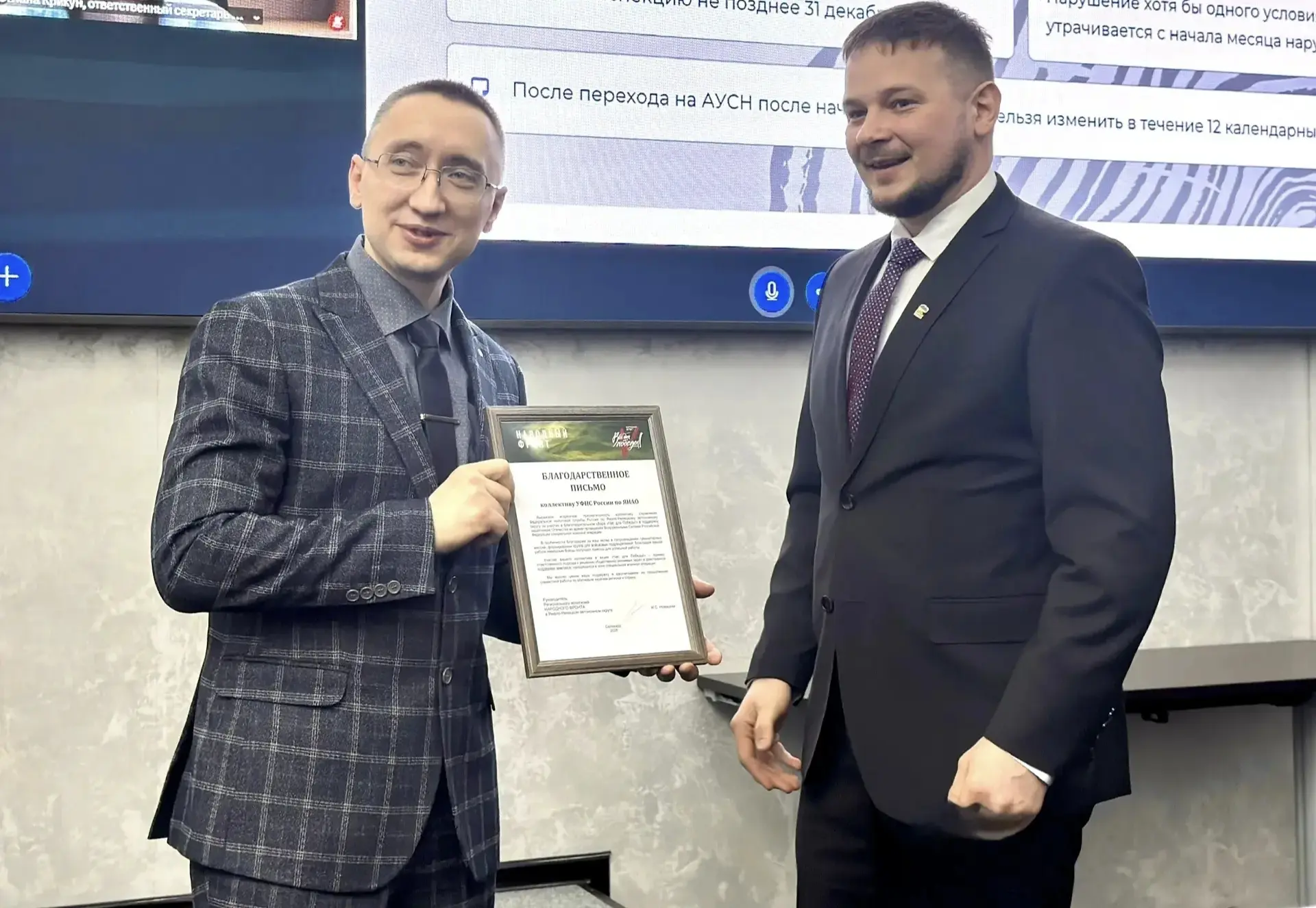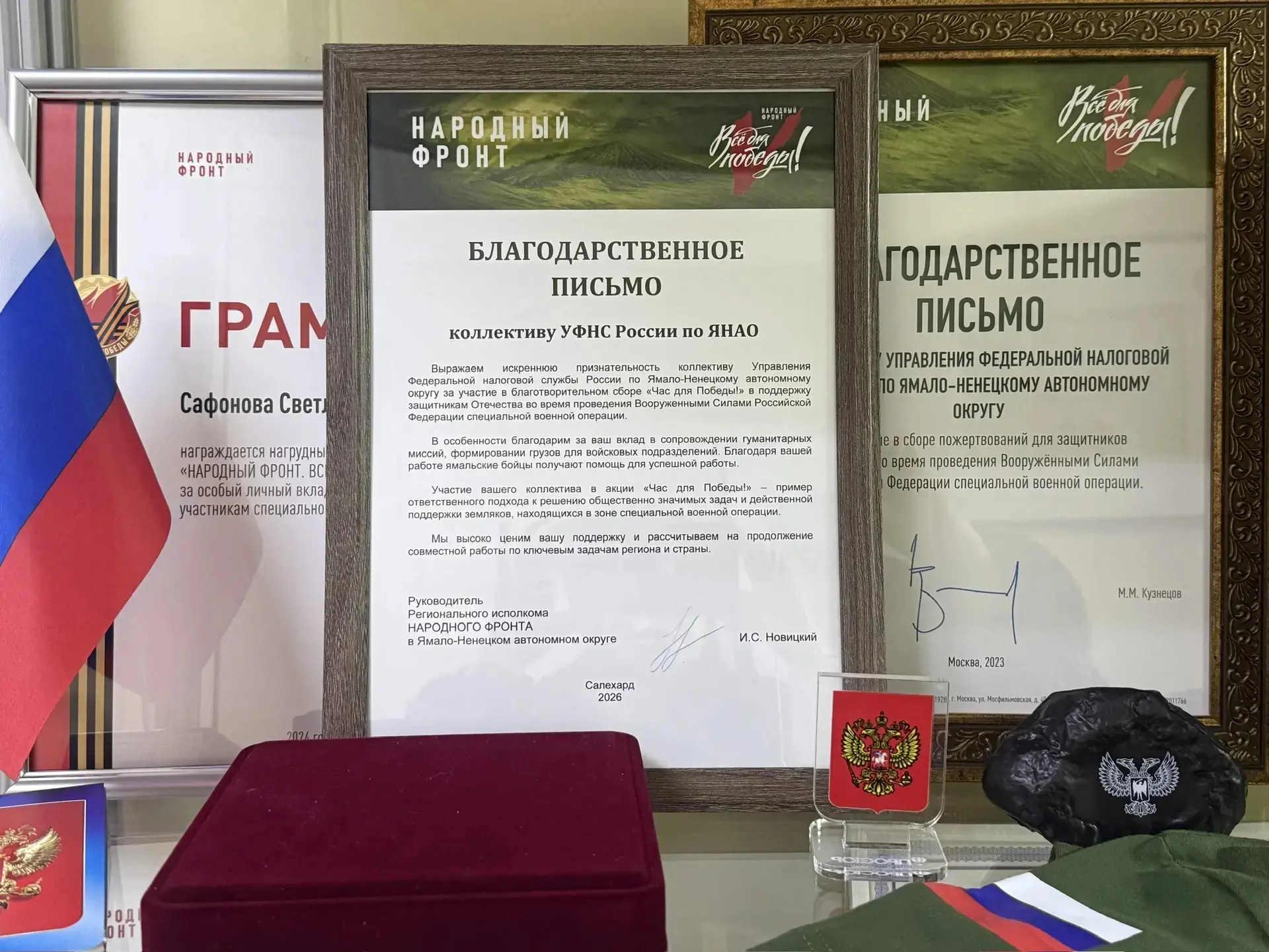 В завершении заседания руководитель регионального исполкома Народного фронта в Ямало-Ненецком автономном округе Иван Новицкий торжественно вручил руководству УФНС России по Ямалу благодарственное письмо. Награда стала признанием заслуг налоговой службы региона за активное участие в благотворительном сборе «Час для Победы!» – акции в поддержку защитников Отечества, участвующих в специальной военной операции. Иван Новицкий особо отметил значимый вклад УФНС по ЯНАО в решение актуальных задач по действенной поддержке граждан региона, находящихся в зоне СВО. Отдельную благодарность Иван Новицкий выразил Руслану Посунько за координацию коллектива налоговой службы, подчеркнув его личную вовлеченность в решение поставленных задач.