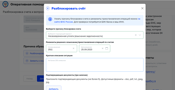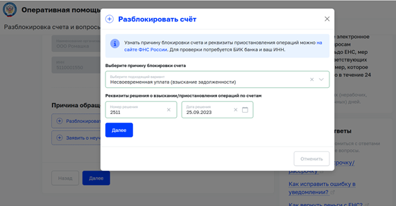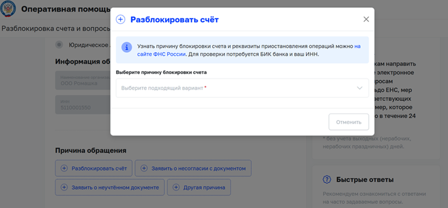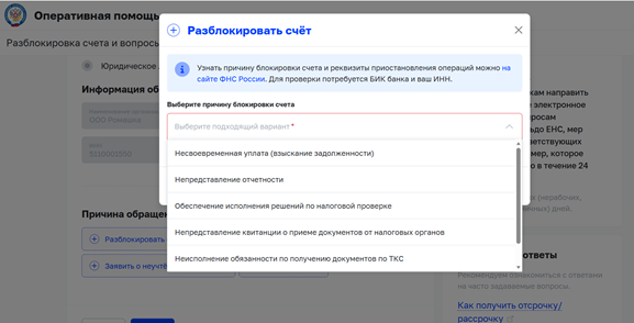 Выбрать причину обращения: «Разблокировать счет»