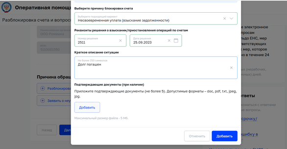 Заполнить поле «Краткое описание ситуации» и приложить подтверждающие документы (при наличии)