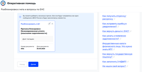 На главной странице сайта перейти в раздел «Сервисы» найти блок «Задолженность/банкротство» и далее сервис «Оперативная помощь: разблокировка счета и вопросы по ЕНС»